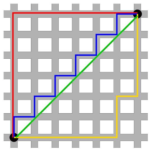 $$d_{man}(p,q) = \sum_{i=1}^n |(p_i - q_i)|$$The following image shows a comparison between the Euclidean distance (green segment) and the Manhattan distance (red, yellow and blue segments) in a two-dimensional space. There are multiple paths to connect two points with the same Manhattan distance, but only one with Euclidean distance.
