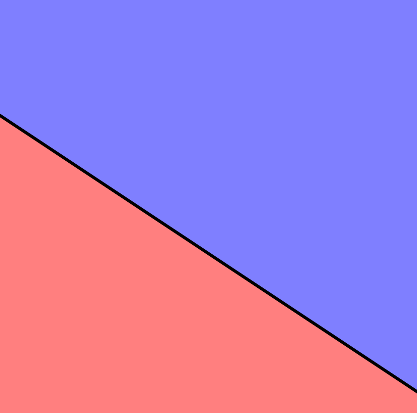 La siguiente imagen muestra el hiperplano de un espacio bidimensional. La ecuación que describe el hiperplano (una recta) es $1 + 2x_1 + 3x_2 = 0$. La región azul representa el espacio en el que se encuentran todos los puntos para los que $1 + 2x_1 + 3x_2 > 0$ y la región roja el de los puntos para los que $1 + 2x_1 + 3x_2 < 0$.