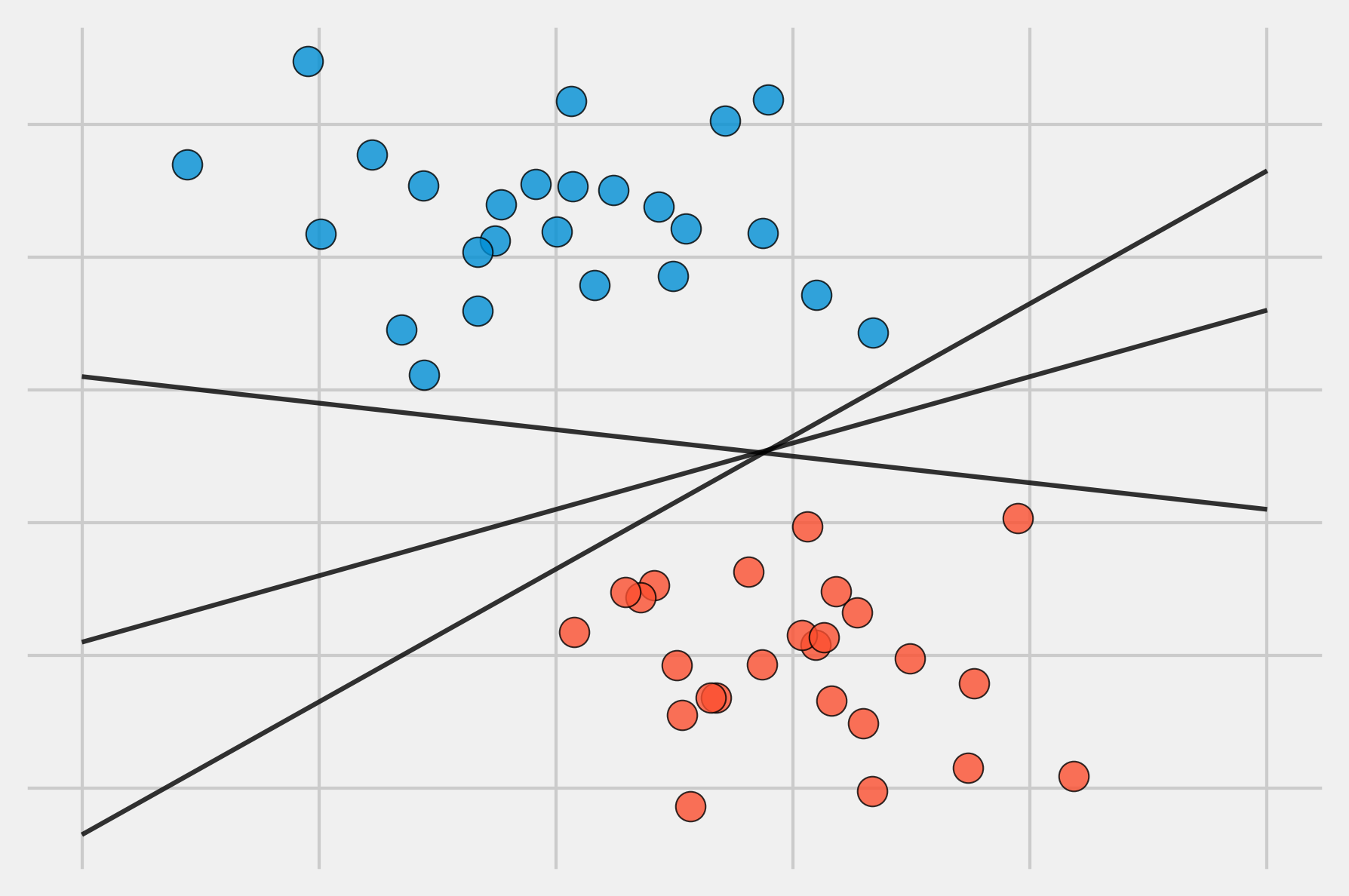 Para facilitar la comprensión, las siguientes explicaciones se basan en un espacio de dos dimensiones, donde un hiperplano es una recta. Sin embargo, los mismos conceptos son aplicables a dimensiones superiores.