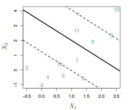 La siguiente imagen muestra un clasificador de vector soporte ajustado a un pequeño set de observaciones. La línea continua representa el hiperplano y las líneas discontinuas el margen a cada lado. Las observaciones 2, 3, 4, 5, 6, 7, 9 y 10 se encuentran en el lado correcto del margen (también del hiperplano) por lo que están bien clasificadas. Las observaciones 1 y 8, a pesar de que se encuentran dentro del margen, están en el lado correcto del hiperplano, por lo que también están bien clasificadas. Las observaciones 11 y 12, se encuentran en el lado erróneo del hiperplano, su clasificación es incorrecta. Todas aquellas observaciones que, estando dentro o fuera del margen, se encuentren en el lado incorrecto del hiperplano, se corresponden con observaciones de entrenamiento mal clasificadas.