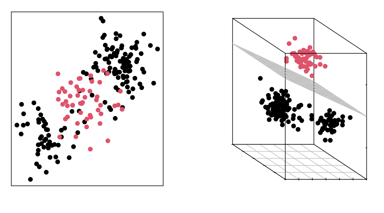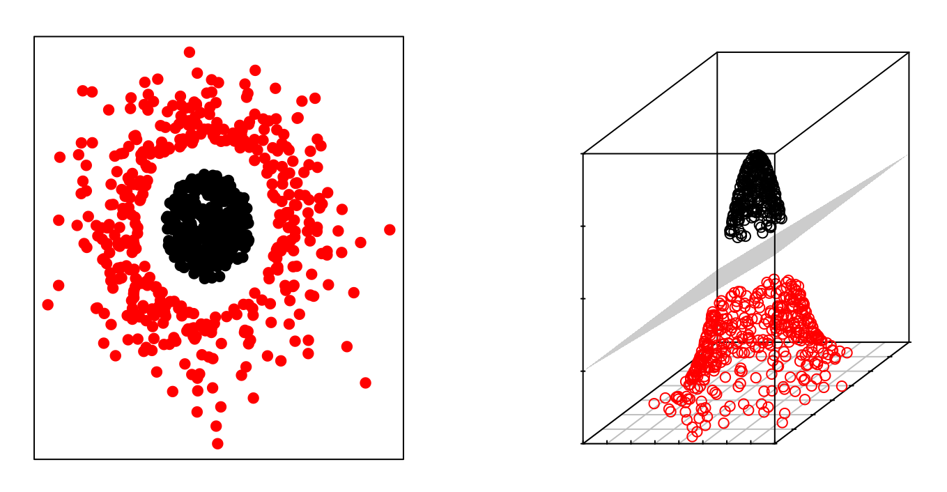 El hecho de que los grupos no sean linealmente separables en el espacio original no significa que no lo sean en un espacio de mayores dimensiones. Las imágenes siguientes muestran dos grupos cuya separación en dos dimensiones no es lineal, pero sí lo es al añadir una tercera dimensión.