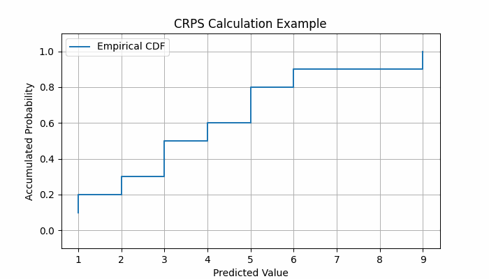 The Continuous Ranked Probability Score (CRPS) is calculated by comparing the empirical cumulative distribution function (ECDF) of the forecasted values to the step function CDF of the true value. When the available information consists of the true value (y_true) and a sample of predictions (y_pred), the CRPS can be calculated by following these steps: