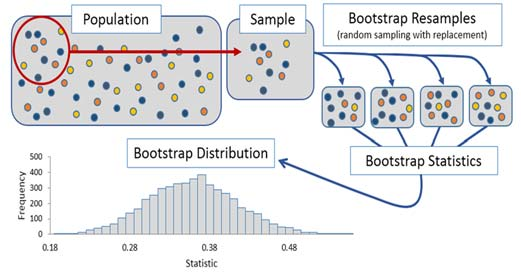 En la práctica, no suele ser posible acceder a múltiples muestras. Si solo se dispone de una muestra, y esta es representativa de la población, cabe esperar que los valores en la muestra aparezcan aproximadamente con la misma frecuencia que en la población. El método de bootstrapping (Bradley Efron, 1979)) se basa en generar nuevas pseudo-muestras, del mismo tamaño que la muestra original, mediante muestreo repetido (sampling with replacement) de los datos disponibles.