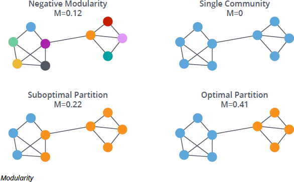 En la siguiente imagen se muestran varios ejemplos de modularidad con distintas particiones. Se puede observar que la mejor partición es la de modularidad más alta.
