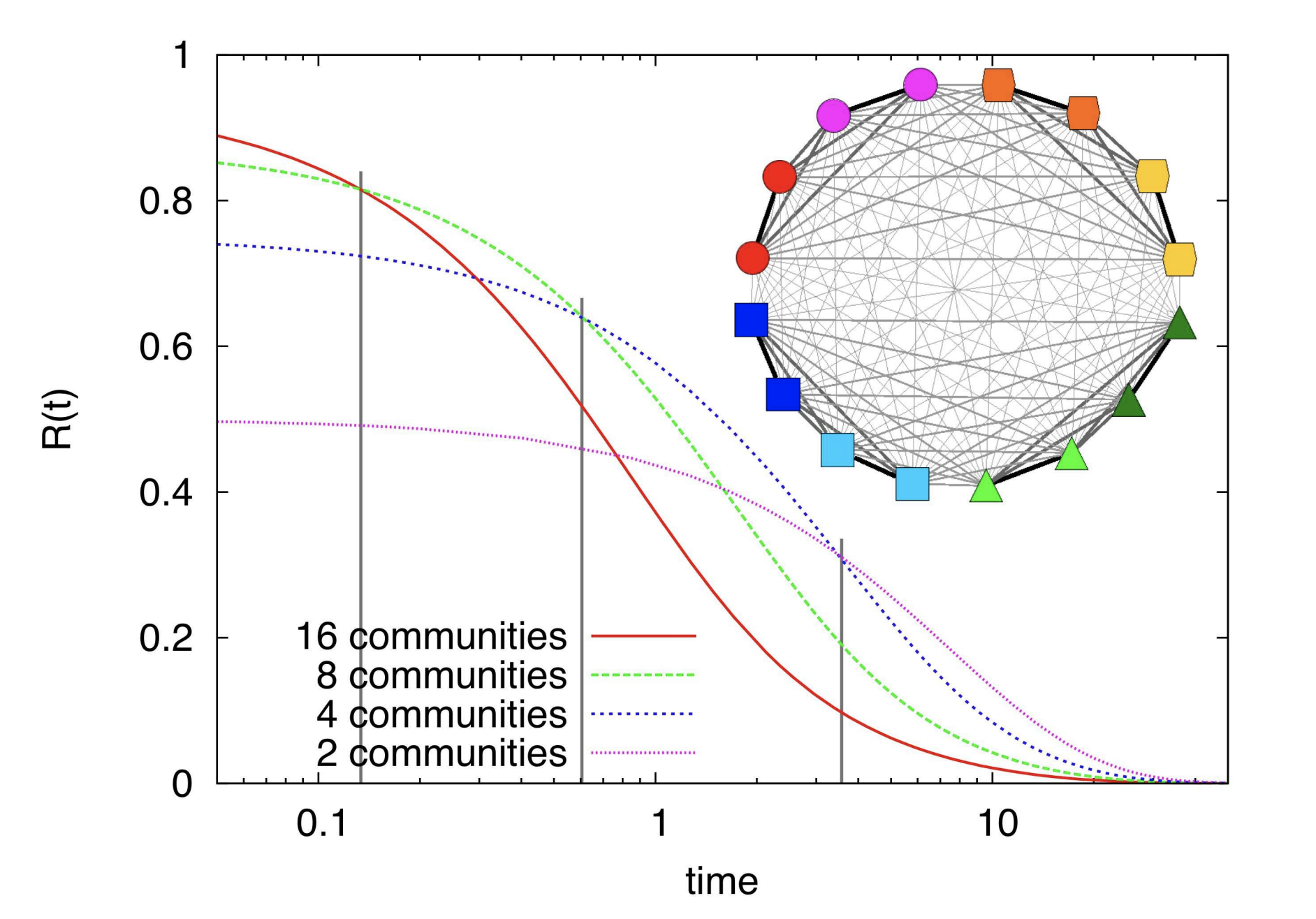 La siguiente figura del artículo "Laplacian Dynamics and Multiscale Modular Structure in Networks" se muestra la influencia del parámetro resolution en la calidad de las particiones ($R(t)$). En la imagen, el parámetro time representa resolution. Se puede apreciar que, cuanto mayor es la resolución, más pequeñas son las comunidades encontradas.